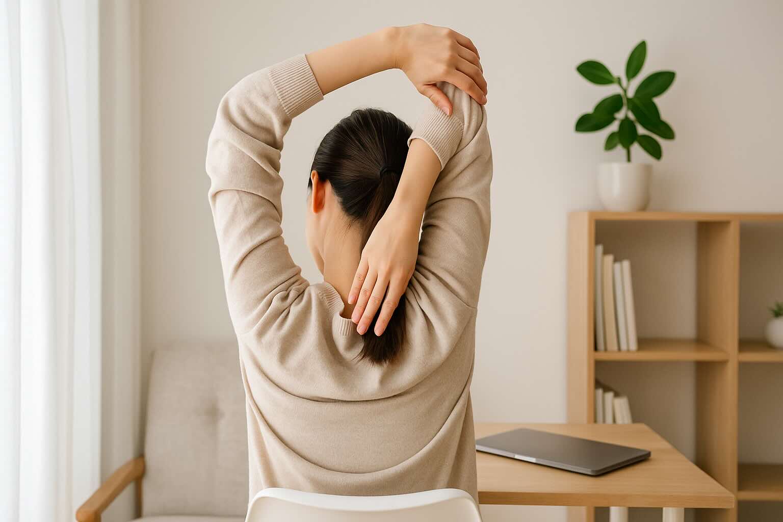 長時間同じ姿勢でいると、肩・首・腰に負担がたまりがちです。ゆっくりと首を回したり、肩を上下に動かしたりするだけでも、血流がよくなり、体がスッと軽くなります。